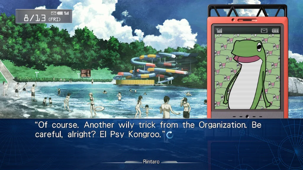 Steins;Gate: My Darling's Embrace jakością scenariusza nie odstaje od pierwowzoru, a wręcz przeciwnie - świetnie go uzupełnia. Pierwsze na myśl przychodzi mi tutaj porównanie do Persony 4 Golden, w której dodano krótki epizod zimowy – niewnoszący nic do głównego wątku, ale pozwalający jeszcze bardziej się zżyć z bohaterami. W moim przypadku odwiedzenie laboratorium po trzech latach to takie ponowne spotkanie się ze starymi, dobrymi znajomymi po długim czasie i przeżycie z nimi nowych, nieprawdopodobnych przygód. Wierzcie mi lub nie, ale zdarzyło już mi się kilka razy wybuchnąć na głos śmiechem za sprawą Daru "Super Hacka", który jak zwykle kradnie show swoimi zboczonymi tekstami. Rintaro Okabe znany też jako szalony naukowiec Hououin Kyouma wciąż jest ekscentryczny i podejrzliwy i ten jego szyderczy śmiech - uwielbiam to! Jedna z najlepiej napisanych postaci w grach wideo. Nie mogło zabraknąć monologu z jego charakterystycznym, czerwonym telefonem i tajemniczym odmeldowaniem: El Psy Kongroo. Będąc jeszcze w temacie telefonu jako kluczowego gadżetu, wpływającego na losy protagonisty - podobnie jak oryginalnej grze, wciąż mamy do niego swobodny dostęp i możemy odbierać i odpowiadać na niektóre wiadomości. W urządzeniu można natrafić na maile związane z eksperymentami z D-mail mającymi miejsce w Steins;Gate, dzięki czemu fani uniwersum poczują się jak w domu.